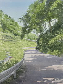 動画は、オンライン会員とオンラインを選択した教室会員Bコースの方がご覧いただけます。今月も2本の動画を準備しました。「ガードレールのある山道」は、マスキングを利用してガードレールを描き、グリザイユ的な技法で林を描きます。「赤い薔薇と影」は、マスキングを使って薔薇と葉を描きます。影は、筆のみで一気に描きます。